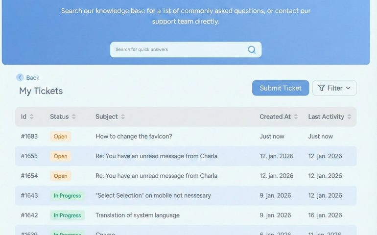I would like to see a support ticket filter and sort option in the customer portal. The filter should allow the option to filter on the various filter statuses, and also sort the tickets based on ID, status, subject, created